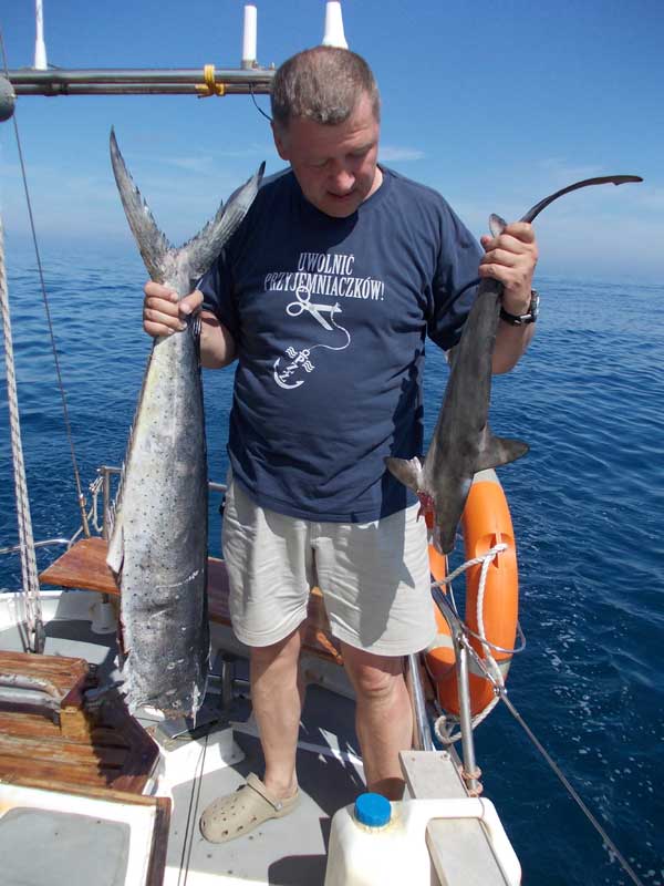 Aha, po drodze nudę rozwiewały różne morskie żyjątka (żółwie na ten przykład) i rybole. Od jednych kupiliśmy dwa mieczniki i dwa małe rekiny za... trzy butelki wody gazowanej :-)