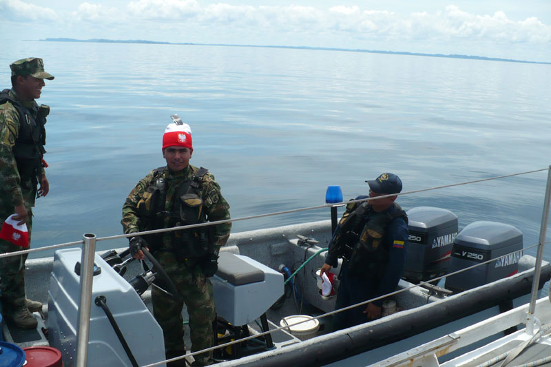 Dosyć szybko przypłynęli - uzbrojeni po zęby, w kamizelkach kuloodpornych. Jeden wszedł na jacht, zrobił kipisz w magazynku u bosmana, stwierdził że łódka jest narkotycznie czysta i możemy wpłynąć na święte kolumbijskie kotwicowisko.