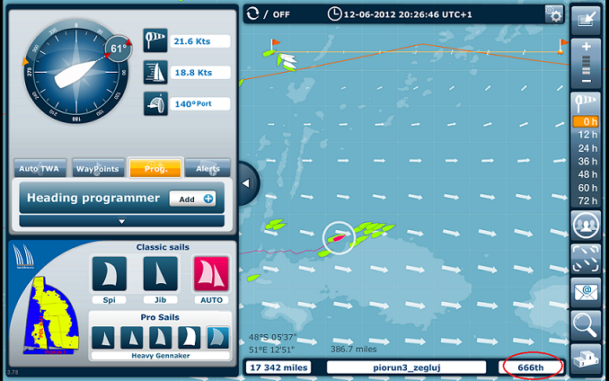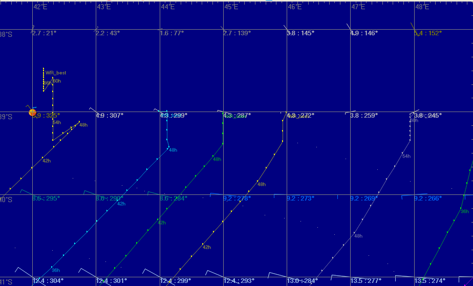 A o tym juz pisałem. Aby zasymulowac jak daleko popłynę na wschód w określonych wiatrach za 36 godzin przy starcie na zachodniej chorągiewce w stosunku do wiatrów za 48 godzin ( to jest ta różnica kiedy się znajdę na poziomie bramki ) przy starcie na wschodniej chorągiewce . Destinejszyn w obu przypadkach gdzieś w kierunku 3 bramki ok 3 -4 dni . Gdyby to się udało zrobić to czas dopłynięcia do określonego punktu w kierunku Destinejszyn , warunkowałby wybór miejsca przecięcia linii bramki, bliżej na zachód czy bliżej na wschód.