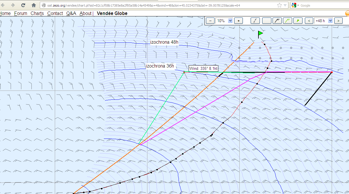 Darek mówię o tym co jeszcze można "wycisnąć" z zyzia. Jak ustawisz troszkę wyżej destinejszyn to uzyskasz isochrony dla cełej bramki, tak jak na załączonym obrazku z Twojej pozycji. Analizując te izochrony, możesz określić za ile godzin przetniesz linie bramek. Wyświetlając układ wiatrów jaki będzie panował w tym czasie i z wykresu polarnego możesz oszacować prędkość po odłożeniu się na kurs np 90. Próbowałem kolorkami zaznaczyć różne warianty trasy