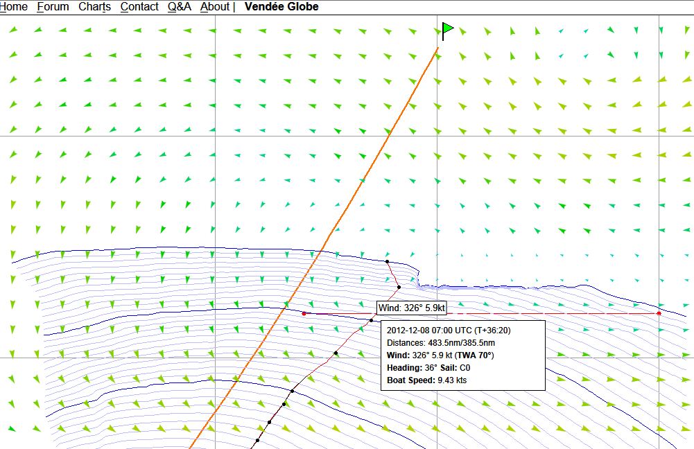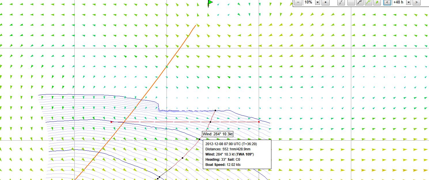 Ale do rzeczy. Ustawiłem tak destinejszyn aby w punkcie 08.12 o 8 rano (7 UTC) byc jak najbliżej bramki , ale tez aby szybkość w jej okolicy była jak największa. Na screenie mam 12knt, przy konkretnym ustawieniu destinejszyn ( wiatry ustawione na za 48 godzin ):