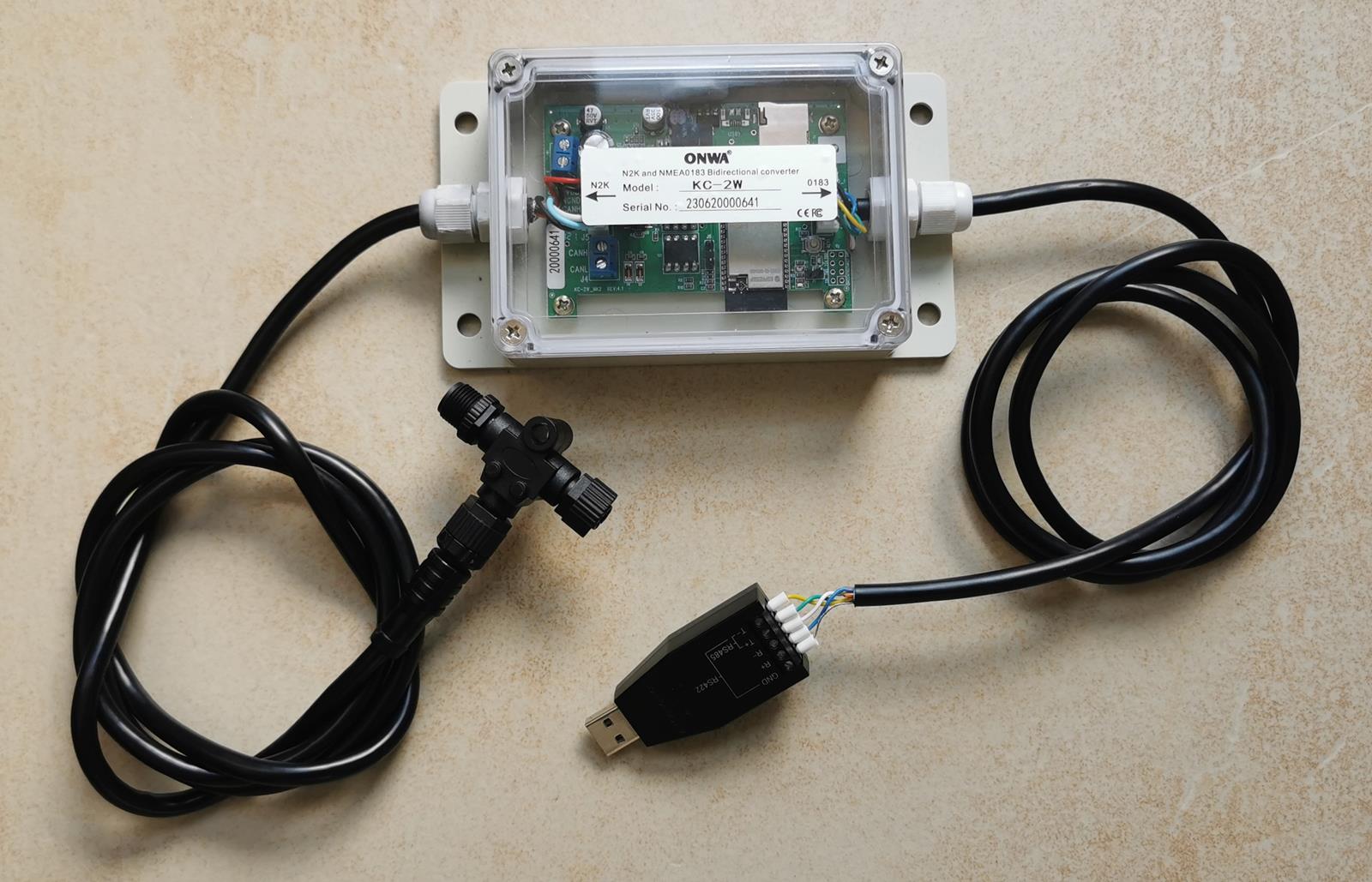 https://pl.wikipedia.org/wiki/NMEA_2000#/media/Plik:Nmea2000_t_connector_and_plug.jpg), aby móc wpiąć się do jachtowej sieci NMEA 2000. Na wszelki wypadek wyjście-wejście NMEA0183 wyposażyłem w konwerter na USB.